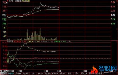 2,开盘后绿线一直保持在黄线上方运行,红线和灰线没有太大表现,说明当天该股主力以空方为主,那么尽量不要介入;