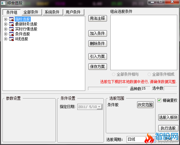 1、选择通达信软件上面的 【功能】--【选股器】--【综合选股】,打开综合选股对话框。