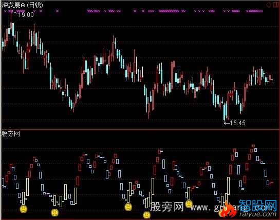 XXX:STICKLINE(VAR4>MA1 AND REF(VAR4,1)<30,VAR4+5,MA1-4,6,1),COLORYELLOW;