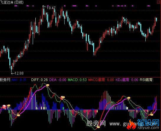 KDJ底背:IF(B2>0,-0.1,0),COLORFF00FF,POINTDOT;