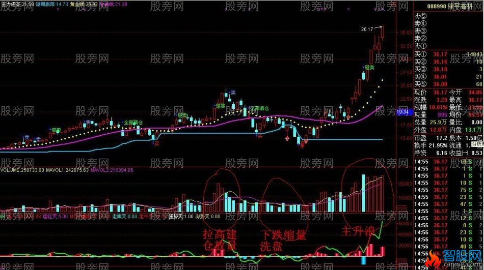 需要指出的是,在主力开始建仓后,某一区域的成交量越密集,则主力的建仓成本就越靠近这一区域,因为无论是真实买入还是主力对敲,均需耗费成本,密集成交区也就是主力最重要的成本区,累积成交量和换手率越高,则主力的筹码积累就越充分,而且往往实力也较强,此类股票一旦时机成熟,往往有可能一鸣惊人,成为一匹“超级大黑马”。